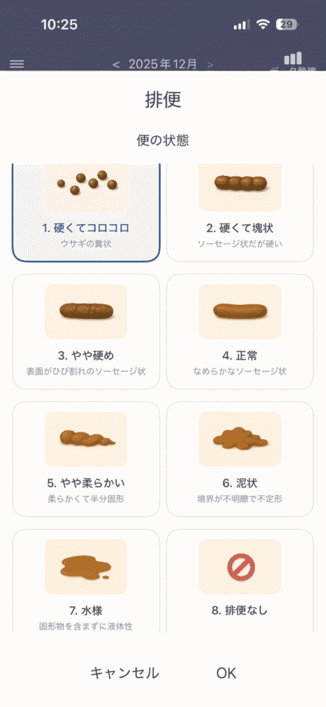 排便記録はこんな風にイラストが表示されるので、近いものを選択するだけ。
