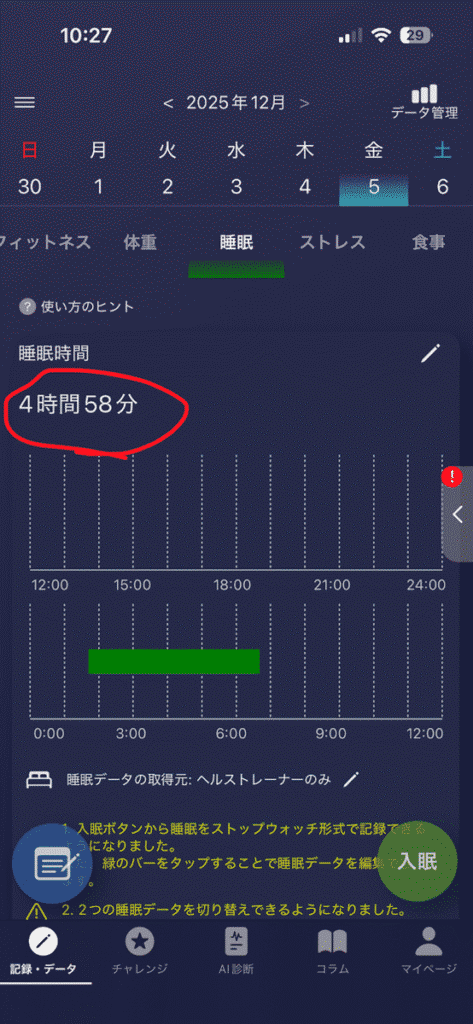 しかし、ヘルストレーナーを見返すと睡眠時間が一目瞭然。