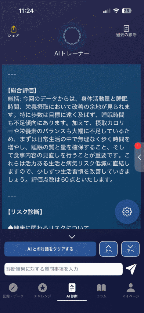 登録した記録をもとにAIが具体的にアドバイスをくれるので、「今日はビタミンが多く摂れる食事にしよう」「明日は一駅分プラスで歩こう」など、対策をとれます。